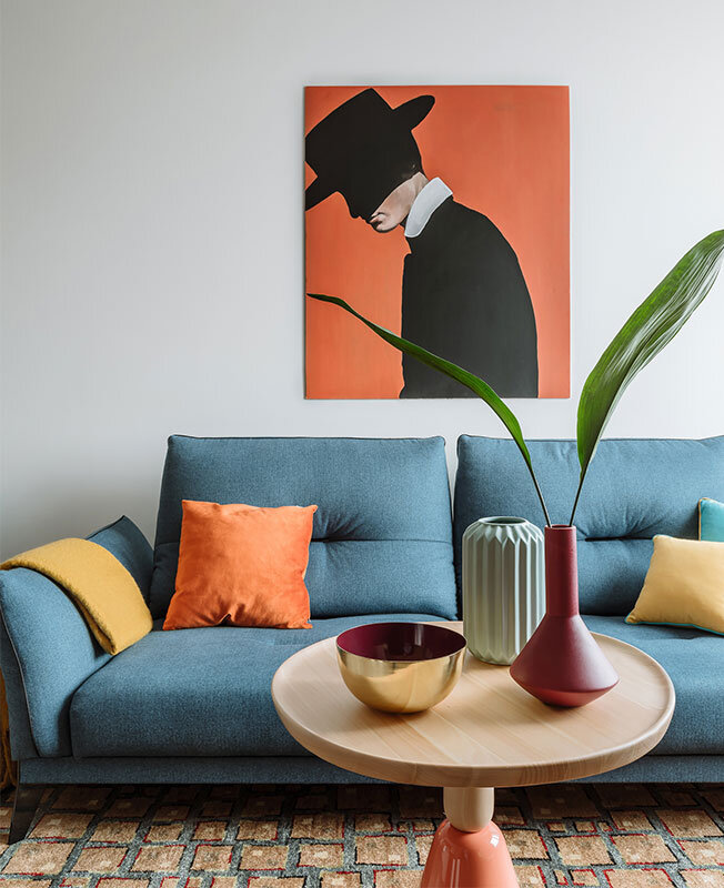 Нейтральная основа интерьера дополнена яркими акцентами: декоративные подушки и картина в гостиной перекликаются с яркими текстилем в спальне и эффектными обоями в комнате дочери.