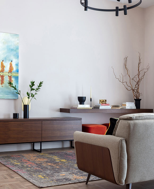 Интерьер квартиры 95 кв. метров в Алматы — работа дизайнера Данары Ахметовой. Главной задачей автора проекта было создать спокойное легкое пространство, где было бы много воздуха, а также уложиться в обозначенный бюджет. Планировку изменили в угоду функциональности: немного уменьшив ванную комнату в спальне и слегка сузив коридор, дизайнер сумела выкроить место для постирочной, которая спрятана в прихожей за дверью скрытого монтажа. Концептуальной основой интерьера стала фотография тибетского монаха в оранжевом одеянии, запечатленного рядом со слоном. «Когда я разрабатывала дизайн, я уже точно знала, что мы нарисуем картину с той фотографии, и она будет висеть в прихожей, встречая хозяев и гостей», — рассказывает дизайнер. «В тон картине мы подобрали барные стулья Calligaris . Завершил образ ковер в гостиной с вкраплениями цветов с еще одной картины — на этот раз три монаха со слоном». Остальные комнаты — спальня и кабинет, решены в спокойной цветовой гамме, единственные акценты — э