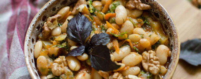 Лобио – блюдо грузинской кухни, вариантов его приготовления великое множество. Основные ингредиенты здесь красная фасоль, орехи, кинза и специи. Подают его обычно горячим с соленьями или свежими овощами и обязательно черным хлебом. Моя мама часто бывала в Кисловодске и именно оттуда привезла рецепт этого блюда. Мы готовим его много лет, немного подправив под свой вкус. В этот раз я готовила из белой фасоли. Лучше всего подойдет фасоль урожая текущего года, в ней достаточно крахмала, в то же время она не будет сухой. Ингредиенты: белая фасоль - 1 кг; помидоры (должны быть спелыми, сочными) - 0,7 кг; морковь - 2 шт. средних размеров; лук репчатый - 5 шт. (крупных); перец сладкий - 4 крупных шт.; грецкие орехи - 200 гр; чеснок - 1 головка; по 1 чайной ложке молотой кинзы и хмели сунели (приправы), также всегда добавляю базилик, он очень сочетается с фасолью, его беру 2 чайных ложки; соль и сахар – по вкусу; масло подсолнечное - 150 мл; масло сливочное - 2 ст. ложки; уксус 70% - 0,5 чайны