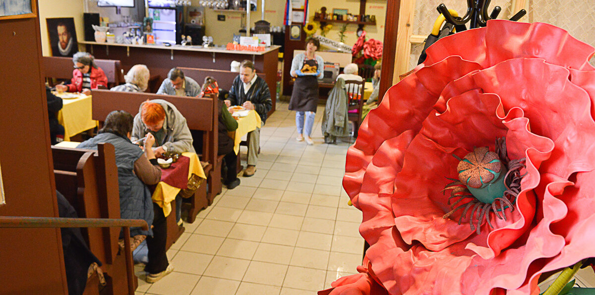В маленьком кафе «Добродомик» за столиками с бодрыми желтыми скатертями обед в самом разгаре. У барной стойки – полки с иконами, пивными кружками и крепостями из спичек. Это подарки благодарных пожилых посетителей. Играет радио, ложки лоскочут, дамы в панамах и мужчины в очках обсуждают, стоит ли смотреть телевизор. Вот уже полтора года с 12 до 16 часов сюда приходят пенсионеры на бесплатный обед. Трапезу прерывает седой импозантный мужчина в коричневом поло «Адидас»: встает перед публикой и густым красивым голосом декламирует «Клеопатру» Пушкина. Все затихает: радио молкнет, волонтеры застывают в дверях с тарелками. Декламатор запнулся, но его поспешили утешить: