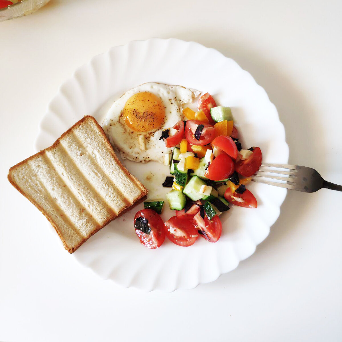 Всем привет! Сегодня пост - рацион, который полностью сбалансирован по калориям, белкам, жирам и углеводам. Вы можете брать и применять для себя, если также как и я любите вкусно и полезно покушать, но при этом не поправиться. Завтрак: Тост с сыром моцарелла 30% (сыра 40 грамм, хлеба вышло 60), 1 жареное яйцо, салат с маслом + 10 грамм сыра сулугуни в салат Насчет хлеба. Я его ем, но не каждый день. Пару раз в неделю можно себе позволить. Лучше конечно есть цельно зерновой, но мне захотелось идеального тоста. Перкус: сырники 140 грамм. Из обезжиренного творога, но жареные на масле. Фрукты на день: банан и 130 грамм слив. В качестве перекуса, разбила на несколько приемов. Полдник: коктейль Велюр на молоке 0,5% (200 мл) и мария печенье 30 грамм Попробовала коктейль сделать на теплом молоке, вкус шоколад. Вышло как какао. Ужин: салат из капусты + сладкий перец + огурец, заправка оливковое масло. Стейк говяжий - 100 грамм, приготовлен на гриле. Капуста в кляре (запекалась) - 60 грам