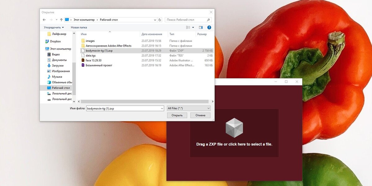 Теперь запустите ZXPInstaller и щёлкните по его окну. Выберите загруженный плагин и подождите, пока приложение установит его.