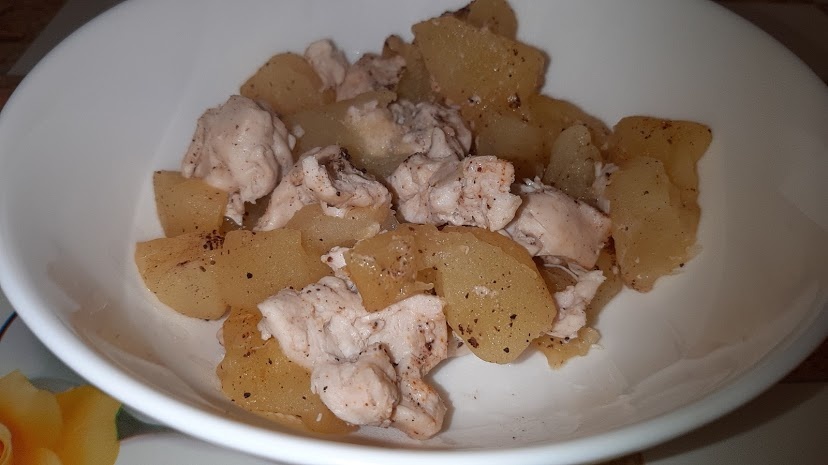 Ну вот и пришла осень, дожди и холод. Незнаю как у вас а у меня осень ассоциируется с яблоками и тыквой. Сегодня готовим быстрое блюдо на перекус,я его готовлю часто, попробуйте и вы. 100 г куриной грудки мелко нарезаем.