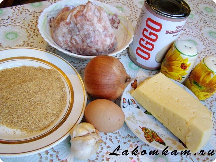 Ингредиенты: фарш свиной — 300 грамм; панировочные сухари — 1\2 стакана; яйцо куриное — 1 штука; соль — по вкусу; сыр — 100-150 грамм; шампиньоны, лучше целые — 1\2 баночки; перец черный молотый по вкусу; чеснок — 3-4 зубчика; большая луковица — 1\2 штуки.