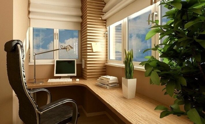 Многие деловые люди хотят иметь дома уединённый рабочий кабинет. Но, что делать, если жилая площадь квартиры не отличается внушительным метражом? В таком случае выделить отдельную комнату для полноценного домашнего офиса достаточно проблематично. Поэтому, приходится искать другие альтернативные возможности устроить кабинет. Превращение свободных метров балкона в полезные: преимущества Одно из лучших решений вопроса – это обустройство рабочего кабинета на балконе или лоджии, которые есть у большинства городских квартир. В данном случае можно выиграть несколько полезных квадратных метров для создания не большого, но изолированного пространства. У такого решения есть и свои преимущества: Итак, если правильно распорядиться ценными метрами добавочной площади, установить компьютерный стол на лоджию, то можно обустроить кабинет на балконе или на лоджии. Предварительно придётся проделать определённые работы по его «перевоплощению». Правильные дизайнерские решения и идеи Небольшое пространств