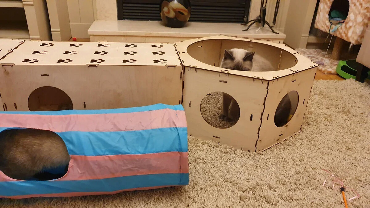 Далее коты по традиции двинулись в гостиную к тоннелям и "котовским" домикам. Если не углубляться в особые подробности, то атмосфера была такая: