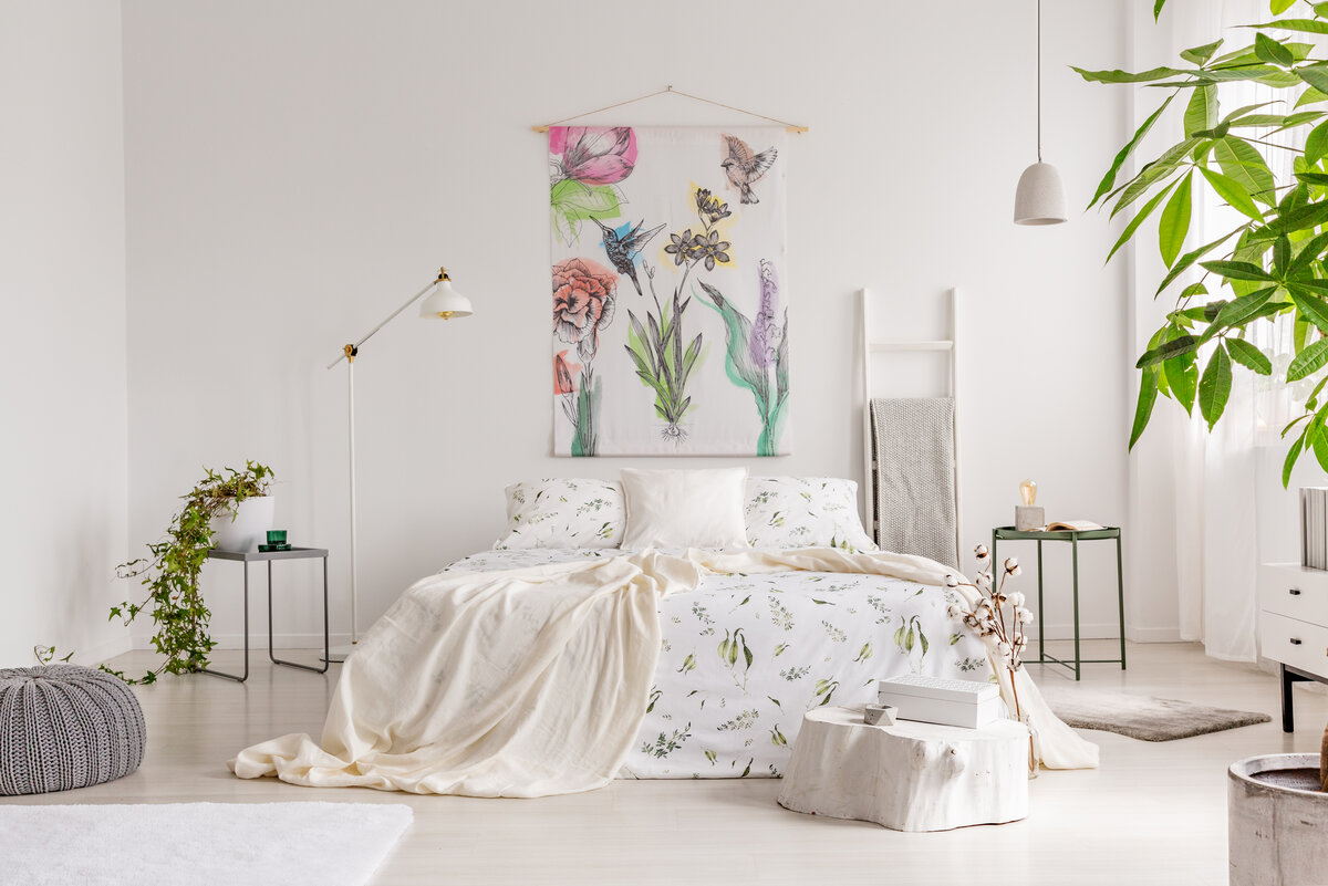 Спальня с белыми стенами – не всегда удачное решение. Четыре белые стены будут скорее напрягать. При этом белый – лучший цвет для постельного белья. Доказано, что из-за ассоциации с чистотой на таком белье человек быстрее засыпает и лучше спит.