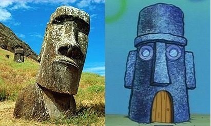 Дома в Губка Бобе довольно странноватые, сам губка живет в ананасе который даже не хочет разрушатся под водой, дом Сквидварда на первый взгляд кажется его изображением. Лицо этого дома напоминает статую Майя с острова Пасхи. 2.Плуто