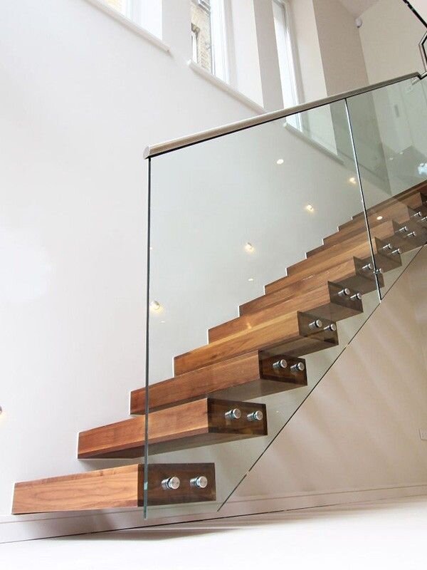 Основная цель этого дизайна - создать впечатление невесомости. Глядя на такой продукт, у вас должно сложиться впечатление, что стекло крепится прямо к лестнице.