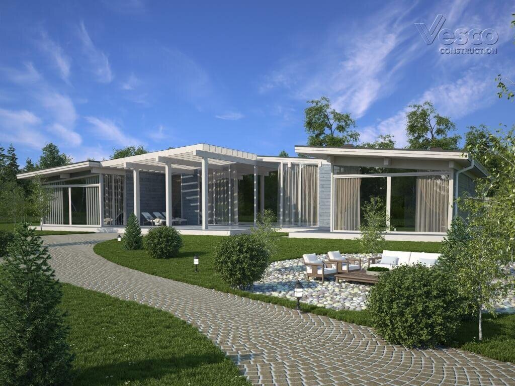 Современное шале с 3 спальнями, бассейном и пятном застройки в 10 соток. Планировка на любителя, и он существует! Проект "Аспен" разработан в стиле одноэтажного современного шале с ориентацией на наши широты и высоту снегового покрова. Этот дом располагается на большом участке, не только потому что он сам значителен по габаритам, но и потому, что задуман как одноэтажный «эко-дом» без хозяйственных помещений — гаража, места для хранения садовой техники и пр. Проект строится вокруг объединенной кухни-столовой с панорамным остеклением и высокими потолками, достигающими 5 м в коньке. Для ценителей роскошной жизни в доме запроектирована «мастер-спальня». Ее площадь составляет 75 кв.м, включая индивидуальный просторный санузел (12,6 кв.м.) и гардеробную (10 кв.м.). При этом, сама спальня занимает 31,5 кв.м., ориентирована на участок и имеет угловое остекление от пола и практически до потолка. Отдельно стоит отметить банно-бассейный блок с тренажерами и огромной террасой с внутренним дво