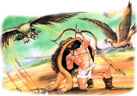 Огорчился царь- батюшка Эфрисей, после второго подвига, что Геракл то, не так прост. Послал глашатая Копрея челом бить пред Гераклом, и упросить извести ненавистных окаянных птиц Стимфалийстких. -Чу, недоброе дело задумал царь, -молвил Геракл соратнику своему Иолаю. Но дело взял. Ужо бояться будет нечисти басурманской. Коротко ли, долго ли дошли они до озера Стимфалийского, что лежало близ Аргосса, царства Эфрисея. Зловонный смрад поднимался над водами озера. Воды темного озера утекали сквозь сыру землю прямо в подземельное царство Аида. Приладил лук Геракл, попробовал силушку богатырскую. Да не видать нигде птиц окаянных. Уж много слышал он, что птицы эти не страшным клювом да когтями страшны, а оперением смертоносны. - Сивка- бурка…то есть чудо-юдо Стимфалийское, встань передо мной, как лист перед травою!, - зычно крикнул Геракл. Но не показались птицы. Тут силы покинули чресла Геракла, упал он наземь вместе с дружинником своим Иолаем. Лежат они, ни живы, ни мертвы, по