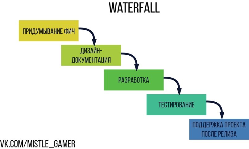 Все это звучит довольно убедительно и логично, только название «водопад» эта система получила неспроста: переход на каждый новый этап предполагает полное завершение работы над предыдущим и возвращение, а также скачки с этапа на этап совершенно не предусмотрены в этой модели. Это лишает ее гибкости, которая так необходима геймдизайну с его вечными плейтестами и переделкой фич. Кому подойдет такая модель? Например, строительной компании: фундамент дома нельзя построить после остекления восемнадцатого этажа.