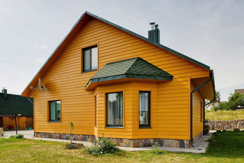 К классическому варианту облицовки здания сайдингом, относится полностью однотонное решение дома, но при таком исполнении дом может стать однотипным и безликим, потеряет свою индивидуальность. Для того, чтобы не допустить данную ситуацию, необходимо выделять углы и проемы дома, а также не стоит забывать про свесы крыши.