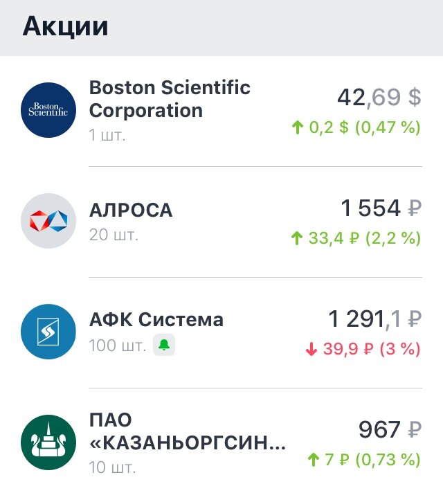 Отчёты за неделю Всем доброго времени суток! Boston и $ сегодня идут в разные стороны. Boston движется вверх и достигает высшей точки за неделю. А $ наоборот идёт вниз, что сказывается на Boston. Последние недели плохо себя чувствует Boston, показатели очень не нравятся. АЛРОСА закрылась в плюсе. Очень хорошие результаты, за короткий промежуток времени, показывает результаты лучше чем у всех акций. Спекулятивная АФК Система это беда😁 Ситуация ровно такая-же, как и с Ашинскими акциями. Только я купил, и акции рухнули в цене. Сегодня закрылась в плюсе. Но общий минус очень большой, пока показатели хорошие, возможно недели хватит для закрытая. КАЗАНЬОРГСИНТЕЗ закрылась в плюсе. Пока показывает хорошие результаты. От этой акции я ожидаю больше чем от Алросы, с учётом исторического движения, пока АЛРОСА показывает лучший результат. Казначейские облигации закрылись в плюсе. Все активы Доход за день Доход 1,88р или 0,01%. Движение котировок за день Всем спасибо! ПОДПИСАТЬСЯ НА КАНАЛ Очень