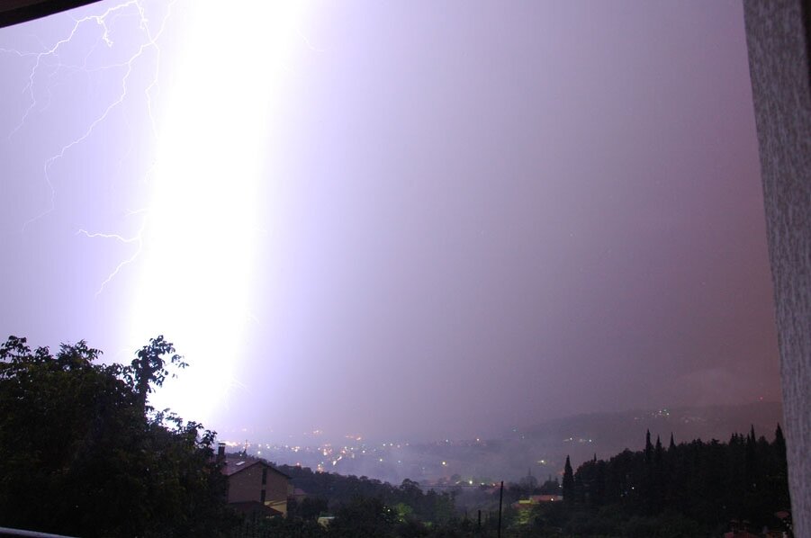 Диафрагма слишком широко открыта и/или слишком высокие значения ISO! Неожиданная молния на близком расстоянии (около 500 м). ISO 200, f/7.1. Полностью выдохся. Если фотография настолько сильно передержана, то ее очень трудно, а иногда и невозможно восстановить в постобработке.