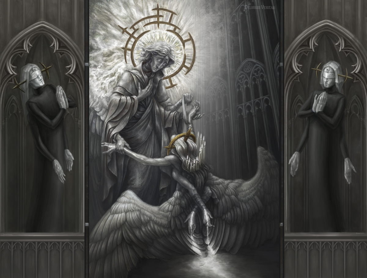 Сразу оговорюсь, я не сравниваю данного автора с великими иконописцами или мастерами в "Готике". Я рассматриваю его как современного художника создающего что-то в очень не популярном сегодня стиле и тематике. И очень прошу вас, если вам нравится и вы хотите следить за развитием автора, то зайдите к нему в группу и поддержите добрыми словами. Прощение И да, я забыл сказать, что всё что рисует автор - это иллюстрации на "небесную" тематику в готическом стиле. И что удивит
