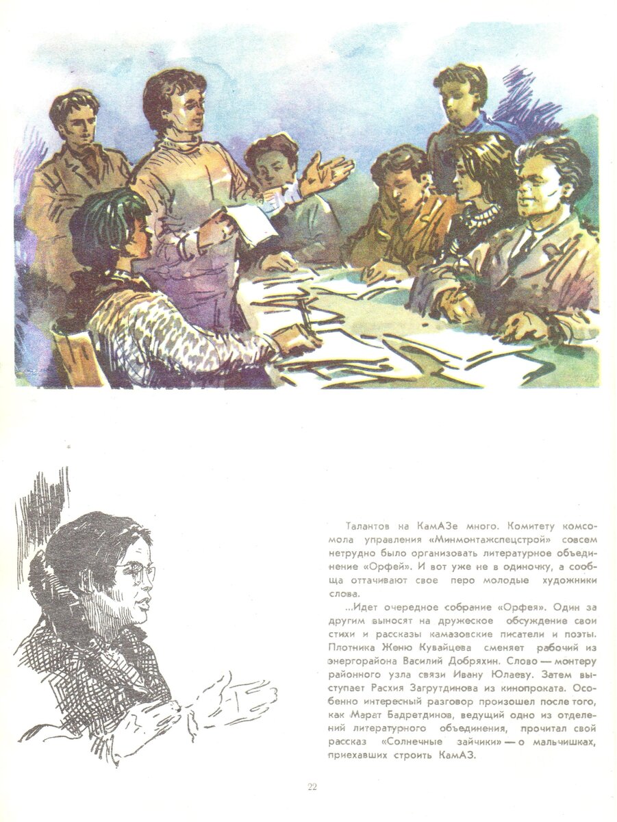 Продолжаем серию публикаций, посвящённую артбуку Виктора Игнатьева о строительстве «КАМАЗа» и Набережных Челнов. Первый пост об этой книге — Артбук «КАМАЗ начинается» (1972) художника Виктора Игнатьева, часть 1 Талантов на КамАЗе много. Комитету комсомола управления «Минмонтажспецстрой» совсем нетрудно было организовать литературное объединение «Орфей». И вот уже не в одиночку, а сообща оттачивают свое перо молодые художники слова. ...Идет очередное собрание «Орфея». Один за другим выносят на дружеское обсуждение свои стихи и рассказы камазовские писатели и поэты. Плотника Женю Кувайцева сменяет рабочий из энергорайона Василий Добряхин. Слово — монтеру районного узла связи Ивану Юлаеву. Затем выступает Расхия Загрутдинова из кинопроката. Особенно интересный разговор произошел после того, как Марат Бадретдинов, ведущий одно из отделений литературного объединения, прочитал свой рассказ «Солнечные зайчики» — о мальчишках, приехавших строить КамАЗ. Поселок завода ячеистых бетоно