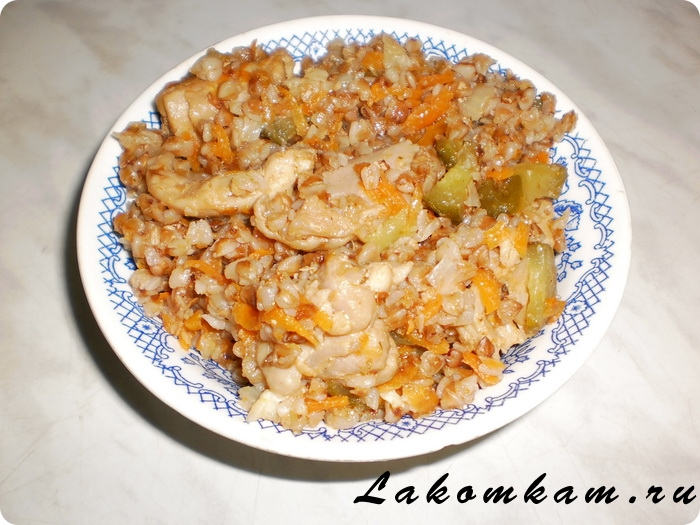 Ингредиенты: гречка — 250 грамм; лук репчатый — 1 штука; морковь — 1 штука; курица (филе) — 300 грамм; томатная паста — 2 столовые ложки; вода — 400 миллилитров; солёные огурцы — 2 небольшие штуки; растительное масло для жарки соль и специи по вкусу.