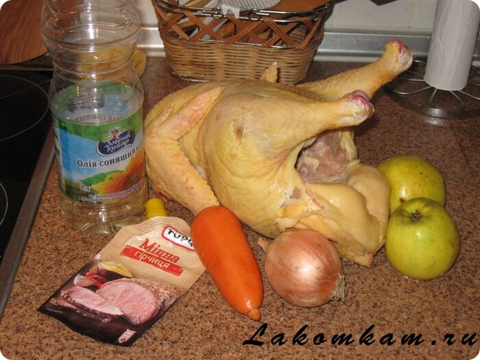 Приготовление курицы запеченной с пряностями, луком и яблоками. Берём необходимое количество ингредиентов.