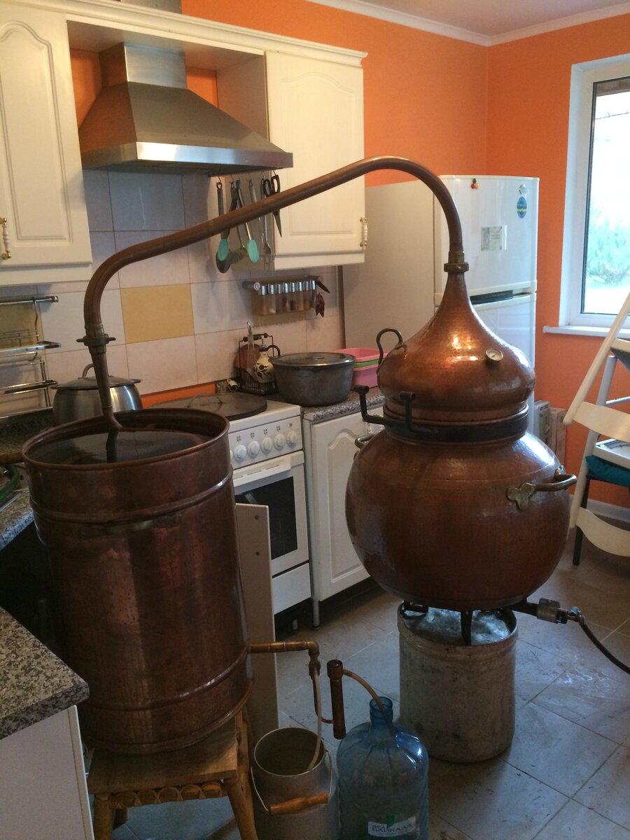 Мне очень захотелось попробовать что-то подобное сделать самому дома, место было, частный дом позволяет. Самую первую установку для дистилляции купил объёмом 30 литров, но из меди, во всех моих производственных опытах это обязательное условие. В качестве сырья вначале использовал яблоки, они растут во дворе, очень удобно. Сейчас 5 различных установок для дистилляции, к тому же отдельные их части можно комбинировать для решения специальных задач. Все спирты обязательно выдерживаются в бочке. Что касается сырья то со временем, получилось поработать с разными видами. Сейчас в основном продолжаю эксперименты с кальвадосом, который выдерживается в старых бочках, яблоки как сырье очень доступны, и мне кажется, у меня кальвадос получается лучше всего. Есть виски из пророщенного покупного солода, бренди из винограда красного, смеси белого и красного, и слива. Был еще любопытный опыт с ромом, из покупной патоки, но результат не очень соответствовал ожиданиям.