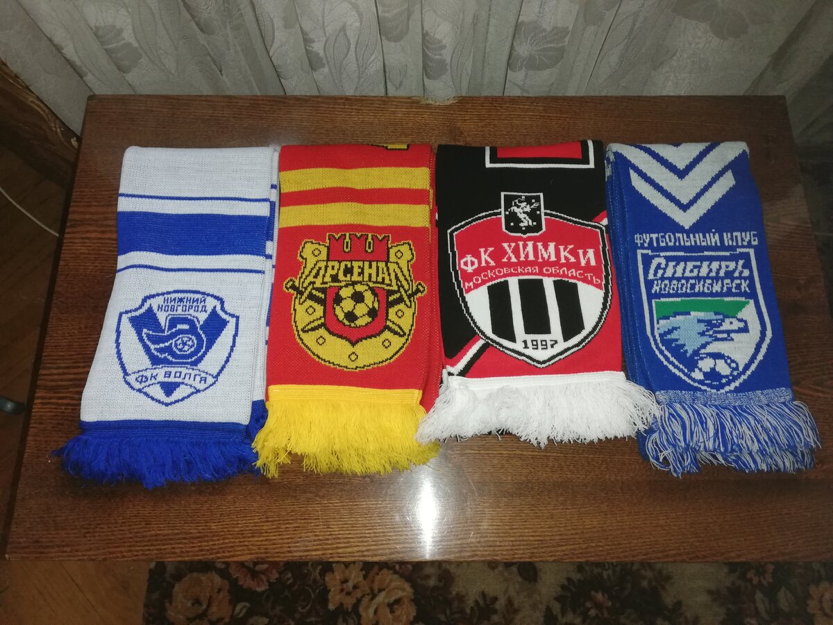 Первым в коллекции стал шарф новосибирской Сибири (на фото справа), за которую я болел с 2010 года и до момента её банкротства. Шарф куплен в 2011 году. Остальные шарфы с этого фото были куплены на выездных матчах Сибири (кроме шарфа ФК Химки), шарф тульского Арсенала - в 2012, а шарф Волги в 2013 году. Шарф Химок был куплен только в нынешнем сезоне ФНЛ на одном из домашних матчей химчан.