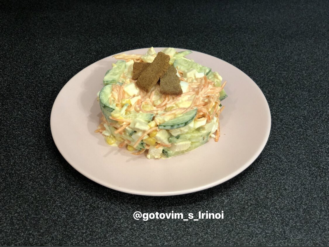 Салат с куриным филе, кукурузой и сухариками.