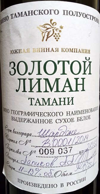 Конечно, никакого защищенного географического указания здесь быть не может. В 2012 году, когда на виноградниках ЮВК собирался этот шардоне, это было только на стадии инициативы. Впрочем, торговая марка и сейчас вполне жива. Вот так выглядит "Золотой лиман Тамани" свежего розлива: