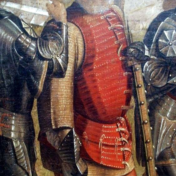 Эта «чудо-куртка», называющаяся бригантина, стала промежуточным звеном между кольчугой и полным латным доспехом. Интересно, что в некотором смысле она стала не шагом вперёд, а шагом назад — в прошлое. Ведь по сути своей бригантина это пластинчатый доспех, а значит её появление можно считать возвратом к утраченным технологиям Римской Империи. Забытый в Европе из-за технологического упадка, пластинчатый доспех был заимствован европейцами во времена Первого крестового похода. Столкнувшись на Востоке с кольчужно-пластинчатыми доспехами (которые к тому времени уже существовали и на Руси), крестоносцы так же стали укреплять свою броню пластинами. Так первыми «бригантинами» в XII веке стали бронированные плащи рыцарей — сюрко. Причём, «бронированный плащ» это их официальное англоязычное название — «coat of plates». Такие сюрко стали дополнять подкладкой с нашитыми пластинами и надевали поверх кольчуги. Привезённые из похода в Европу и доказавшие свою эффективностью, такие «плащи» быстро стали