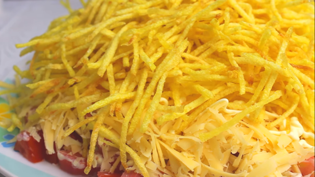 Всем огромный привет! Хочу поделиться с вами рецептом обалденно вкусного хрустящего салата блондинка! Для приготовления этого салата нам понадобится: Приступим к приготовлению. Для начала нам нужно почистить картофель и натереть его на терке для корейской моркови. Картофель промываем в воде от крахмала и подсушиваем бумажными салфетками. Далее отправляем картофель на сковороду с маслом и обжариваем как картофель фри. лПосле чего выкладываем картофель на салфетку, чтобы впитался лишний жир. Приступим к приготовлению соуса. Для этого натираем на мелкой тёрке чеснок, добавляем майонез и хорошо перемешиваем. Режем помидоры кубиками. Колбасу нарезаем на пласты, а сами пласты на соломку. Натираем на крупную тёрку сыр. Начинаем собирать наш салатик. Выкладываем помидоры, подравниваем, и смазываем их соусом. Затем выкладываем колбасу и поливаем её тонкой сеткой из майонеза. Следующий слой будет сыр, его тоже поливаем майонезом. Выкладываем последним слоем картошку. Салат готов! Он получаетс