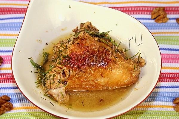 Курица просто восхитительная. Очень мягкая и сочная, пропитанная соусом. Про соус нужно сказать отдельно. Соуса получается не слишком много, но он такой вкусный, что его до последней капли хочется подобрать кусочком лаваша. У соуса приятная бархатистая текстура. Аромат грецких орехов сильно ощущается. Но надо всем доминирует сильный и очень аппетитный аромат чеснока.