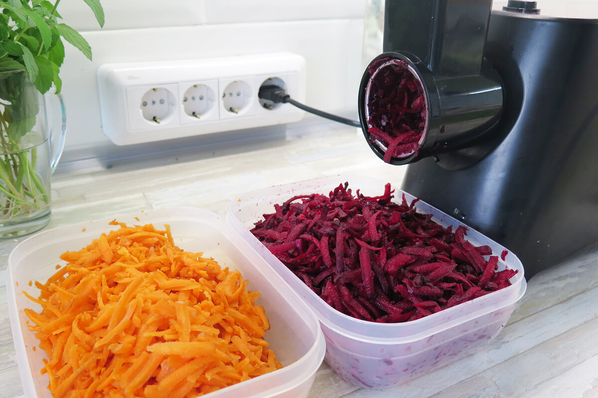 Взяли на пробу и не пожалели. Удобная штука. Что мясо прокрутить, что овощи нашинковать. А еще у нее есть насадка для приготовления колбасок. Но ей еще не испытывали.
