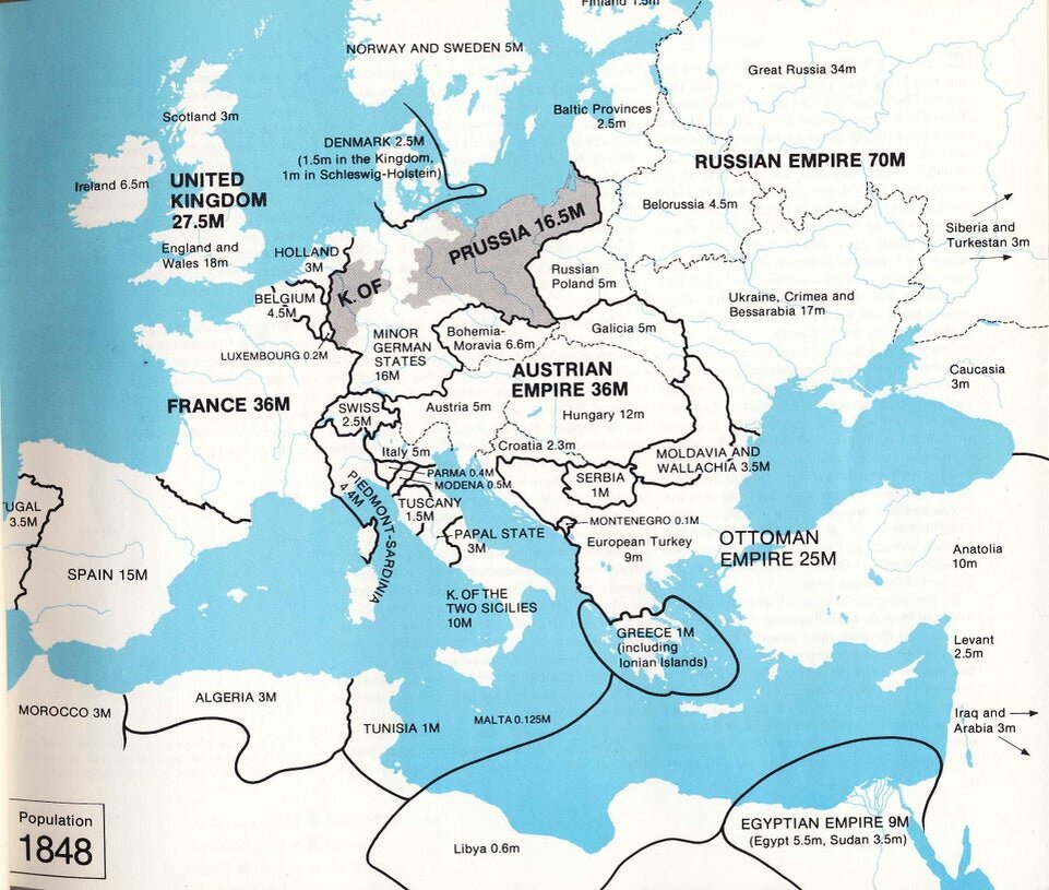 1. Если мы посмотрим на население стран Европы в 1848 году и сопоставим с нынешним, то практически везде мы увидим значительный рост. Исключением является Ирландия (в те времена — составная часть Британской империи), где как раз 170 лет назад в самом разгаре был Великий картофельный голод. Из-за голода и последующей эмиграции население Изумрудного острова сократилось более чем вдвое и до сих пор не восстановилось: