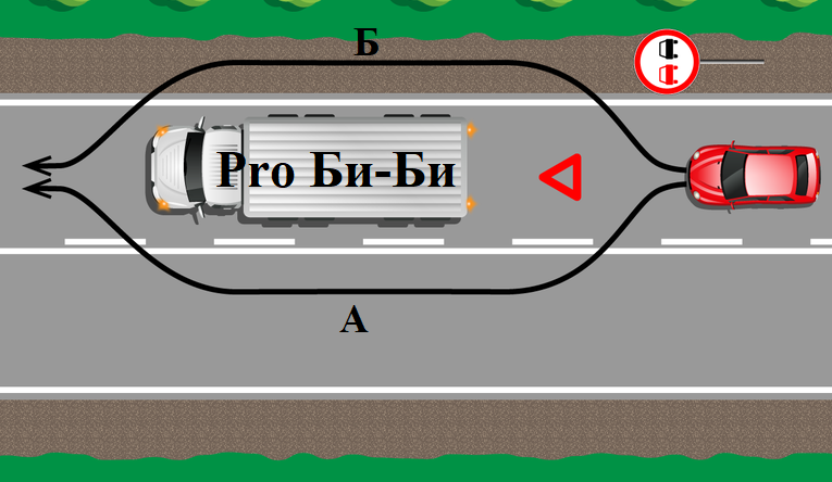 Здравствуйте дорогие читатели и гости канала Pro Би-Би! Сегодня с Вами разберем еще один вопрос на знание ПДД. Вопрос не особо сложный, но все равно некоторые совершают ошибку. И мы сегодня его разберем. Давайте представим, что мы едем вне населеного пункта и перед нами стоит грузовой автомобиль. Видимо у него лучилась поломка, был выставлен знак аварийной остановки. Соответственно мы не можем за ним стоять и нам надо его объехать. Обратим внимание, что имеется сплошная линия со стороны встречного движения и прерывистая на нашей стороне. Так же установлен знак "Обгон запрещен". Если бы не этот знак, мы могли бы спокойно объехать без каких либо нарушений. Давайте сначала определимся где обгон запрещен, нам в этом поможет п.п. 9.9 9.9. Запрещается движение транспортных средств по разделительным полосам и обочинам, тротуарам и пешеходным дорожкам (за исключением случаев, оговоренных в пунктах 12.1, 24.2 Правил). Допускается движение машин дорожно-эксплуатационных и коммунальных служб,