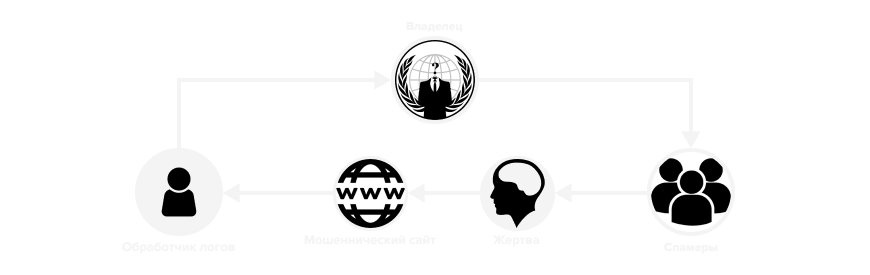 Распределение рабочей силы в адвертинге сильно напоминает нам антикино. Во главе стоит человек, который как и в случае с антикино, владеет сайтом, как правило всего одним, он же делает выплаты основной части рабочей силы - спамерам. Также в схеме присутствует дополнительно обученный человек, обрабатывающий приходящие логи (аккаунты).