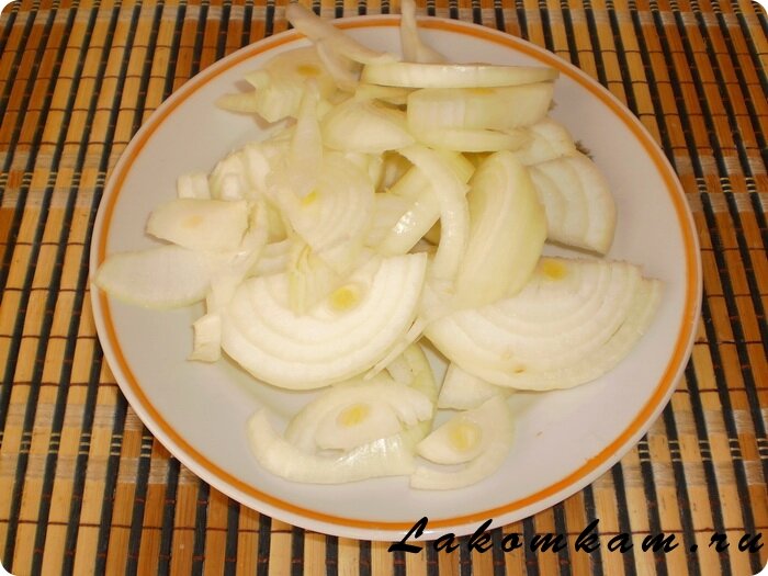 Приготовление чахохбили из курицы в мультиварке. Лук режем полукольцами.