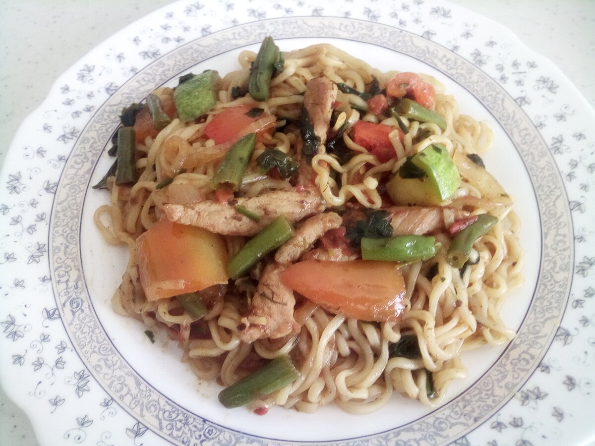 Сегодня попробовал приготовить Вок из "лапши быстрого приготовления".Получилось вкусное и довольно достойное блюдо. Вок-это приготовление еды методом быстрого обжаривания при постоянном помешивании, который называется стир-фрай (stir-fry с англ. «жарить и перемешивать»). Поехали... Нам понадобиться: Что делаем: 1. Нарежем соломкой мясо,как на бефстроганов 2. Почистим и нарежем полукольцами лук 3. Нарежем небольшими квадратиками помидор 4. Нарежем квадратиками кабачок 5. Нарежем квадратиками болгарский перец 6. Нарезаем укроп и петрушку 7. Чистим и нарезаем чеснок Когда всё подготовили ставим на плиту сковороду ( с высокими стенками.Я готовил в небольшом казане)и включаем на сильный огонь. Как только масло нагрелось и зашипело,выкладываем мясо Пока наше мясо жариться,нальем в кастрюлю воды,добавим наши корешки от зелени,а так же зелень с пакетиков от лапши( Не добавляй масло и приправу от лапши ) После того,как лишняя влага и сок из мяса выпарились, и оно подрумянилось,добавляем наши