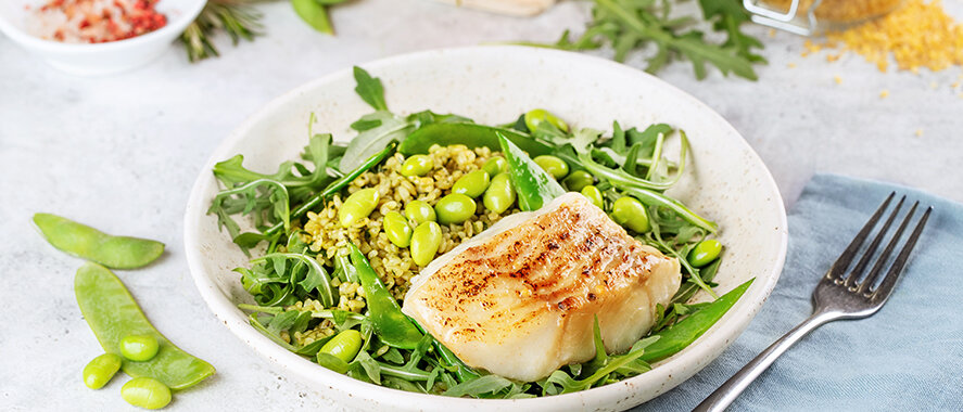 Треска пашот с зеленым булгуром – ресторанное блюдо для такого случая.