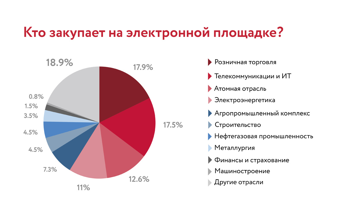 Третьем по объему торгов стал рынок заказов от предприятий атомной отрасли, которые входят в ГК «Росатом». Доля этого сегмента достигла 12,6% от общего объема закупок на площадке.