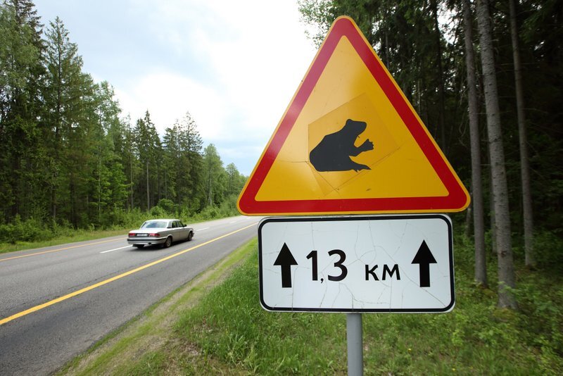 Я сначала было подумал, что знак предупреждает о том, что ехать надо осторожно, так как можно наехать на лягушку, а ведь она скользкая. Следовательно, от попавшей под колеса квакушки машину может занести. Да, вот так немного наивно я подумал, что сотрудники безопасности дорожного движения предупреждают водителей о такой необычной опасности.