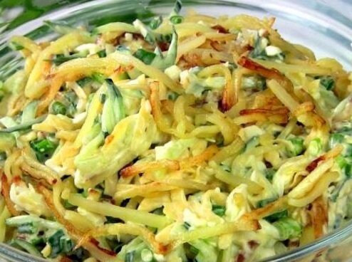 Говорят, что салат "Диер" пришел к нам из узбекской кухни. Он очень сытный и вкусный, поэтому может с легкостью выполнить роль гарнира к мясному блюду. Ингредиенты: Готовим: 1) Картофель помыть, очистить, натереть на терке для корейской моркови. Промыть в холодной воде, откинуть на дуршлаг. Обжарить до готовности небольшими партиями на растительном масле. Выложить на бумажное полотенце, чтобы избавиться от масла. Остудить. 2) Огурцы натереть на терке для корейской моркови или нарезать тонкой соломкой. 3) Яйца очистить, натереть на терке. 4) Сыр также следует натереть на терке. 5) Соединить все ингредиенты в салатнике, посолить, заправить майонезом. Посыпать зеленым луком. Такой салат будет прекрасно смотреться на праздничном столе, если его выложить послойно: