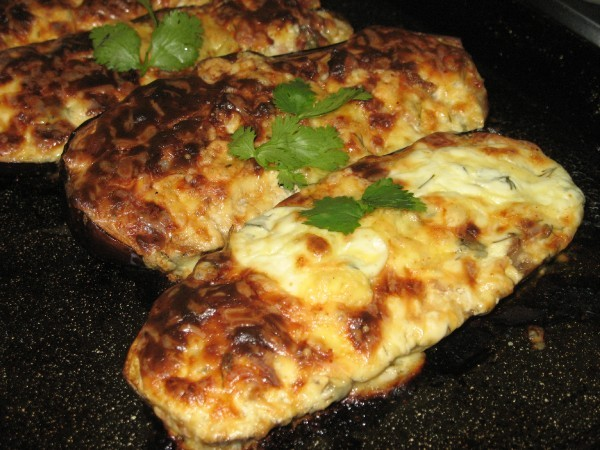 6. Поставить в духовку при t=180°C на 40~45 минут. (Баклажаны готовы, если при протыкании они будут мягким и сырная поверхность ста