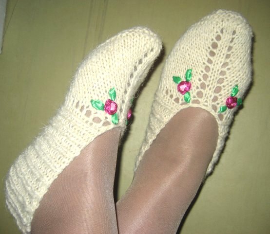 Для вязания подошвы можно добавить синтетическую нить. Тогда носочки будут служить намного дольше.Эти носочки вяжутся от линии цветочков (на картинке) и заканчиваются за пяточкой.