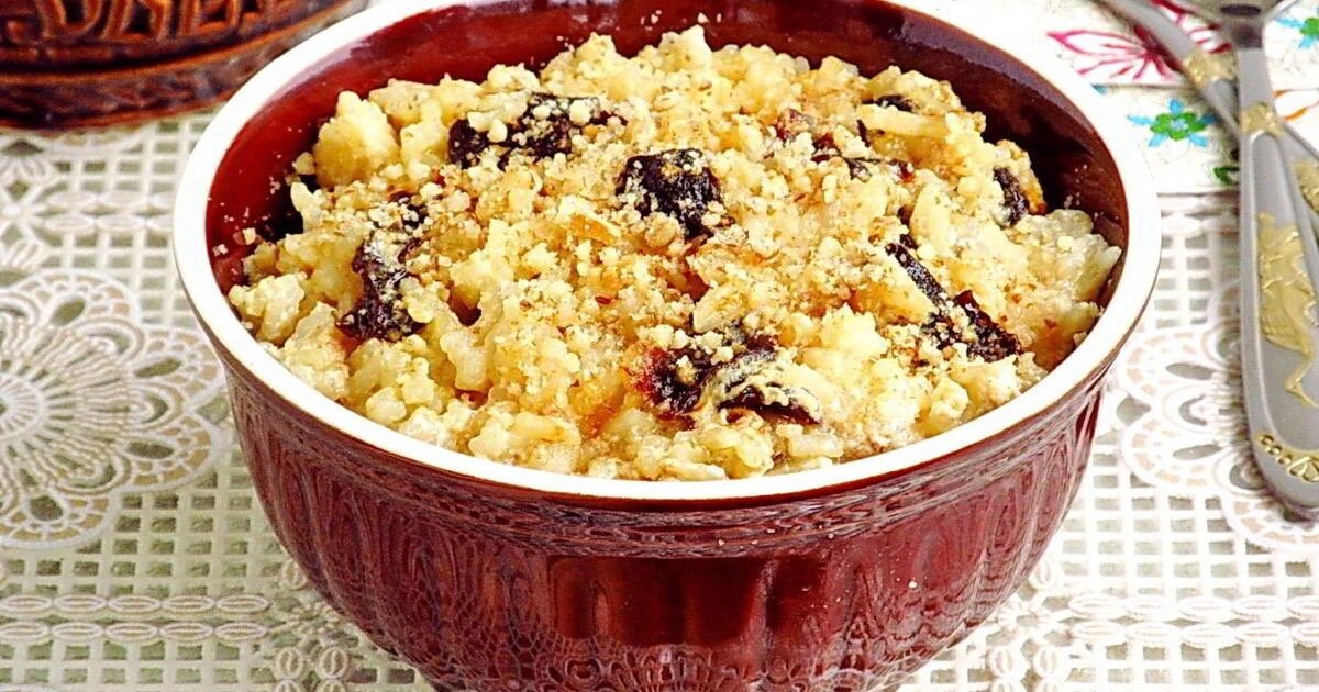 Ингредиенты: 1 стакан риса, 3 стакана молока, 100 грамм сливочного масла, 2 яйца, 1/2 стакана сахара, 4 грамма ванилина, 50 грамм орехов, молотые сухарики. Из риса и молока сварить вязкую кашу, остудить и соединить с ванилином, растертым маслом. Яйца хорошо взбить с сахаром, добавить в кашу. Орехи измельчить и так же положить в кашу. Форму смазать маслом, посыпать сухарями, выложить кашу, запечь в духовке. К каше можно подать молоко с сахаром или горячее какао со сдобными булочками.