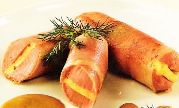 Ингредиенты: 6 сосисок, 6 ломтиков сыра, 6 ломтиков копченой корейки, растительное масло, зелень петрушки Сосиски надрезать вдоль. В разрез положить ломтик сыра и ломтик копченой корейки, положить на смазанный противень и выпекать в духовке. Украсить зелень. Подавать с отварным рисом. Совет: Чтобы рис оставался белым, при варке в воду нужно добавить немного уксуса.