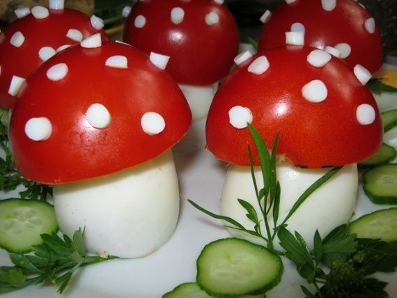 На праздники принято подавать на стол вкусные и красивые блюда. Я нашла оригинальный рецепт закуски. Главное, что блюдо просто и быстро готовится, но выглядит очень красиво. Отмечу, что закуска порадует своим вкусом, она очень сытная. Вам понадобится 5 яиц, соленые и свежие огурцы, помидоры. Понадобится мясо, причем выбрать вы можете по своему вкусу. Я беру ветчину, но ее можно заменить любым отварным или копченым мясом. Также подготовьте специи по вкусу. Я предпочитаю добавлять перец и соль. Не забудьте про сливочное масло. Приготовление не отнимет много времени. Сперва отварите яйца, остудите их и очистите скорлупу. Овощи помойте и высушите. Далее переходите к подготовке формочек "грибочков". Яйцо будет выполнять роль ножки, а красный помидор — шляпки гриба. Аккуратно срежьте верхушку яйца, чтоб был виден желток. Желтки необходимо вынуть. У помидор тоже срежьте верхушки, очистите мякоть ложкой. Желтки и мякоть томата не выкидывайте, они пригодятся вам в дальнейшем. Очень мелко наре