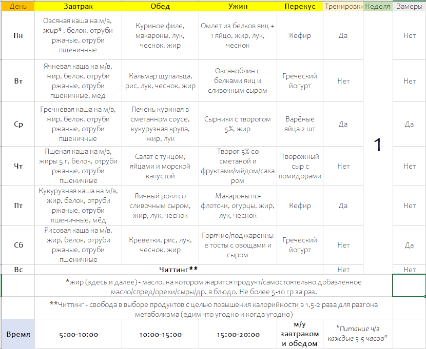 В1-Е7: варианты блюд на каждый приём пищи. В течение дня нужно получать не менее 30% от всего рациона из жиров, не менее 1 г на 1 кг веса из белка, а всё остальное занять углеводами (2-4 г на 1 кг веса). С последними очень легко переборщить, поэтому уделите большое внимание белку. Многие не добирают его в процентном соотношении (должно быть 25-40% от всего рациона). Так как я готовлю свои белковые блюда с луком, чесноком и специями, то везде пишу про их использование. Вы же можете отталкиваться от собственных предпочтений. К категориям пищи со звёздочками (*) есть ссылки в таблице чуть ниже. Расчёт КБЖУ – это сугубо личное дело человека. Если вы желаете набрать мышечную массу – повышайте калорийность на 15-20%. Если вы желаете похудеть – снижайте калорийность на 15-20%. Соотношение БЖУ в процентах при этом не меняется. Запомните, что как только вес встаёт, производится перерасчёт нужной суточной калорийности, так как организм со временем привыкает к любому питанию.