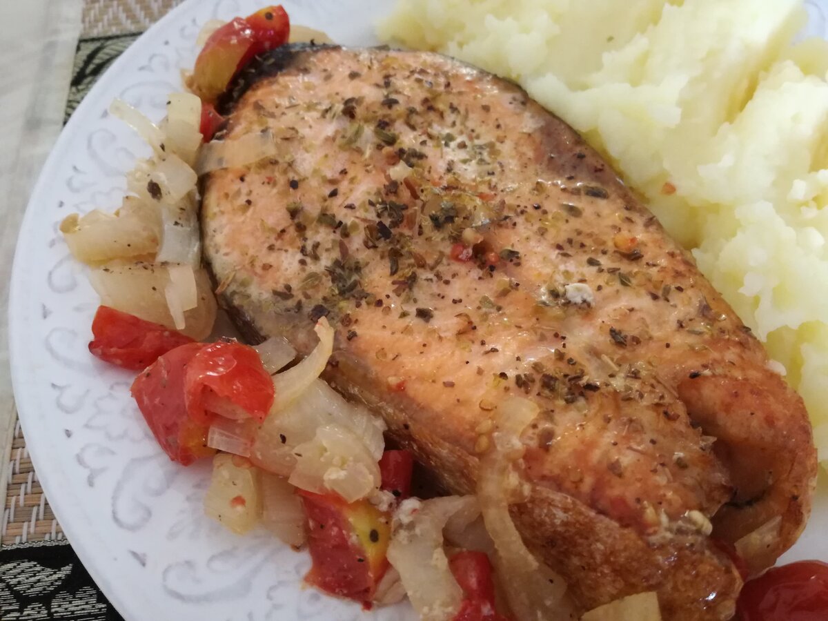 Раз в неделю мы стараемся есть рыбу: в виде супа, запеченую или жареную. На моем канале есть много разных вариантов приготовления рыбки и сегодня будем вкусно запекать стейки лосося. Итак, поехали! Нам понадобится: стейки лосося черри помидоры 1 луковица соль, перец, тимьян оливковое масло Для соуса: 200 мл сливок 25 г слмвочного масла 1 ч.л. муки Способ приготовления: Лук режем не очень крупными кусочками, черри помидоры на четвертинки. Смазываем оливковым маслом форму для запекания и выкладываем туда овощи. Солим и сверху укладываем стейки лосося. Рыбку сверху солим, перчим и посыпаем тимьяном. Ставим запекаться в заранее разогретую духовку минут на 20. Лосось готовится очень быстро, тут главное не передержать, чтобы стейки не были сухими, поэтому гарнир я делала отдельно (картофель за 20 минут, как известно, не пропечется))). Тем временем готовим соус по принципу бешамеля: растапливаем масло в сотейнике, добавляем муку, размешиваем и вводим сливки, постоянно помешивая. Варим на медл