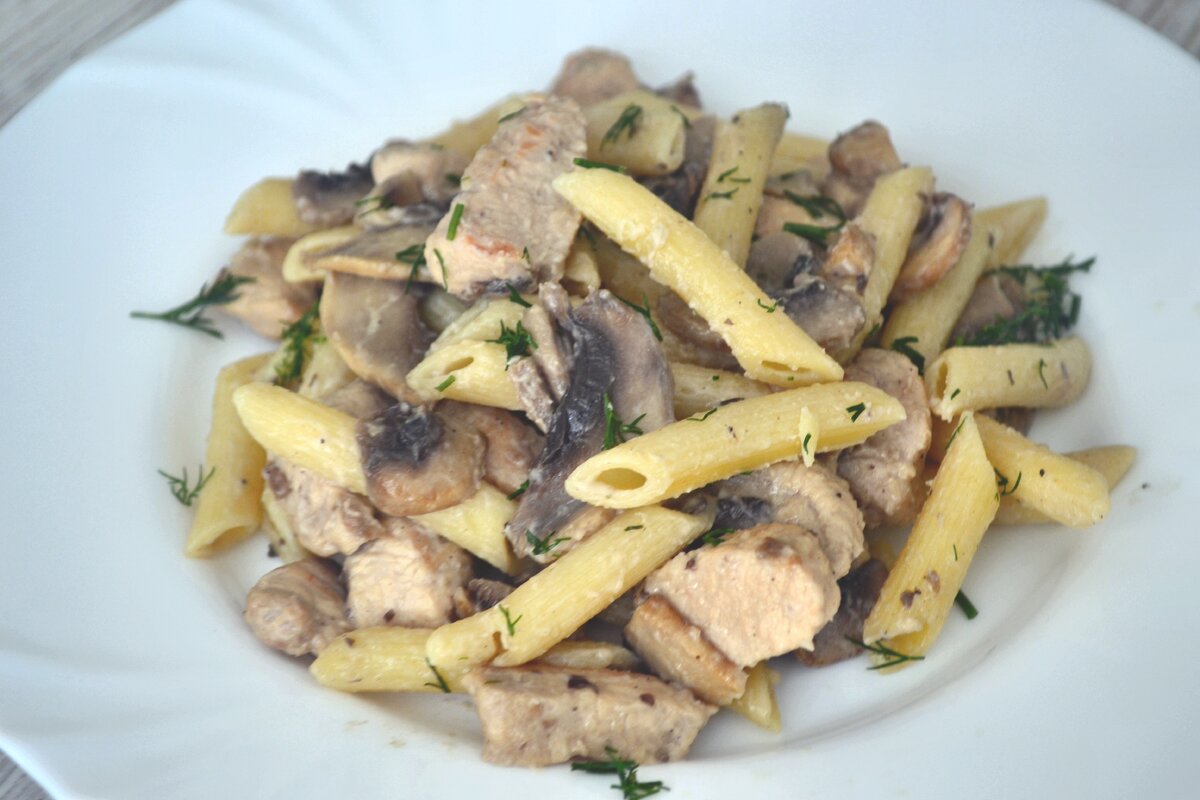 Друзья, всем большой привет! Предлагаю приготовить очень вкусное, сытное блюдо за 15 минут из простых продуктов - макароны с индейкой, грибами и плавленным сыром. Обязательно попробуйте, я уверена, если попробуете вы просто влюбитесь в этот рецепт и будете часто так делать! То блюдо, которое действительно готовится 15 минут, а накормить можно всю семью! Ингредиенты: Приготовление: Филе индейки промываем и нарезаем на небольшие кусочки. В этом рецепте филе индейки можно заменить куриным филе. Шампиньоны промываем, нарезаем пластинами, для этого блюда грибы лучше нарезать крупно. Макароны сварим до готовности в большом объеме воды, время варки указано на упаковке, затем откинем на дуршлаг. Разогреем сковороду с растительным маслом, выложим индейку, добавим соль и черный перец, обжарим мясо 2 минуты. Затем добавим шампиньоны и продолжаем обжаривать до готовности грибов. Добавляем плавленный сыр и прогреваем чтобы сыр расплавился. Перекладываем макароны, перемешиваем и подаем, при подач