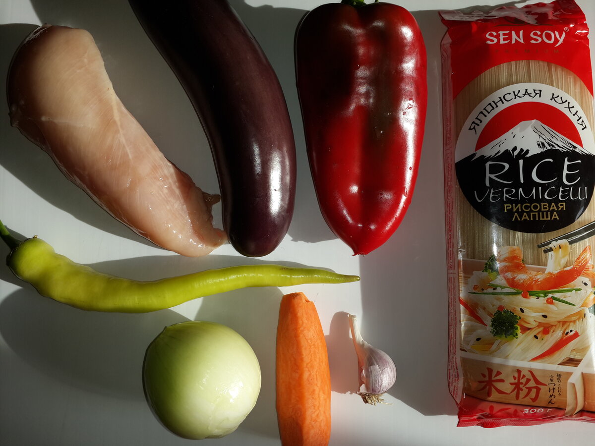 Китайская лапша очень популярна, среди множества блюд, которые можно приготовить или заказать на дом. Не удивительно, ведь в лапшу можно добавить те ингредиенты, которые вы любите. Овощи, грибы, различные виды мяса. Так что же такое WOK на самом деле? WOK - это сковорода с высокими, тонкими стенками и толстым дном. А мы сегодня приготовим рисовую лапшу с курицей, которую рекомендуют делать как раз на такой сковороде. Нам потребуются: Приготовление: 1. Режем куриное филе на тонкие полосочки, маринуем • соевый соус • чёрный перец • зубчик чеснока • соль 3. Режем морковь, баклажан, болгарский перец соломкой 4. Лук кубиками. 5. Чили перец колечками (можете без него, если не любите острое) 6. Обжариваем мясо и все овощи по отдельности, на максимальном огне. Чтобы они зарумянились, но остались сочными. Овощи должны быть полусырыми, чтобы хрустели. 7. Занимаемся лапшой Делаем как написано на упаковке: Варим 6 минут в кипящей, подсоленной воде на сильном огне. Без крышки. Затем откидывае