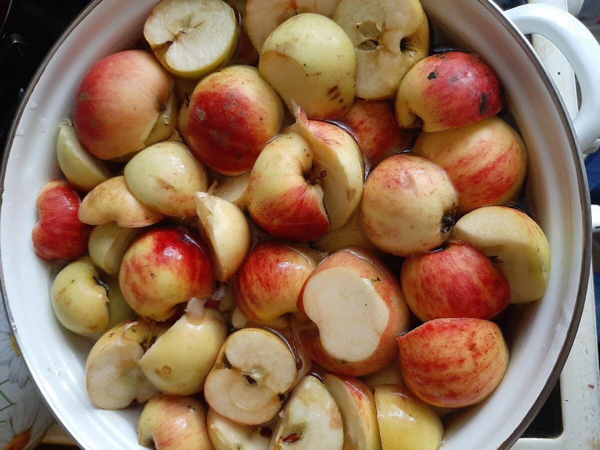 Сегодня я расскажу об одном замечательном рецепте. Этот рецепт мне рассказала моя подруга 8 лет назад. И сегодня я о нем вспомнила. Вспомнила, потому что один мой хороший знакомый привез мне целый мешок вкусных яблочек. Ну не пропадать ведь добру! Это пюре подойдет даже для малышей, потому что яблоки перетираются через сито два раза, что исключает присутствие в пюре мелких волокон. Кроме того, яблоки измельчаются блэндером, а само пюре кипятится. А еще получается полезный витаминный компот! Яблочки маленькие и поэтому мысль о том, что нужно каждое яблоко очистить от кожи и косточек меня не вдохновляла. Поэтому я решила поступить немного нестандартно. Итак, промываем яблоки, гнилые выбрасываем. Для уверенности в том, что яблоко не гнилое внутри, можно разрезать каждое яблоко пополам. Косточки я не удаляю. Кстати, полазив в интернете, я узнала о том, что в косточках яблок содержится очень редкий витамин, который позволяет выглядить моложе. Промытые и отобранные яблоки складываем в к